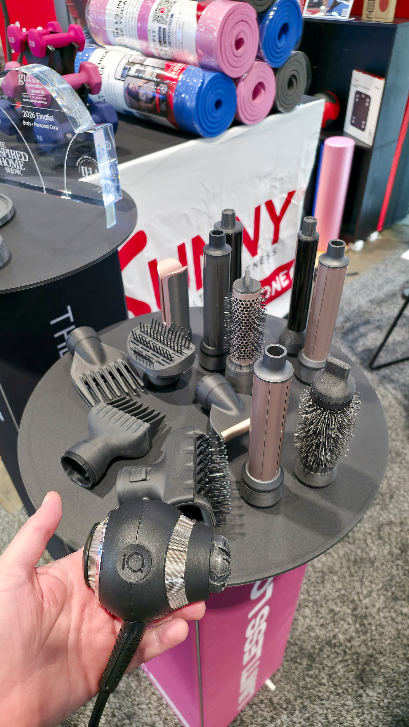 Tradiční italský výrobce spotřebičů pro vlasovou péči nabízí unikátní kompaktní fén iQ Sfera, který váží pouhých 240 g, dokonale padne do dlaně a má moderní digitální motor dosahující až 92 000 ot./min. Tento model je určen pro profesionály, nikoliv spotřebitele, nicméně zástupci firmy nám během diskuse sdělili, že připravují i verzi pro domácí uživatele. Kromě toho nabídne firma k tomuto výrobku mimořádně pestrou paletu příslušenství, jejichž prototypy můžete vidět na fotce. Vysoušeč tak získá spoustu nových funkcí.