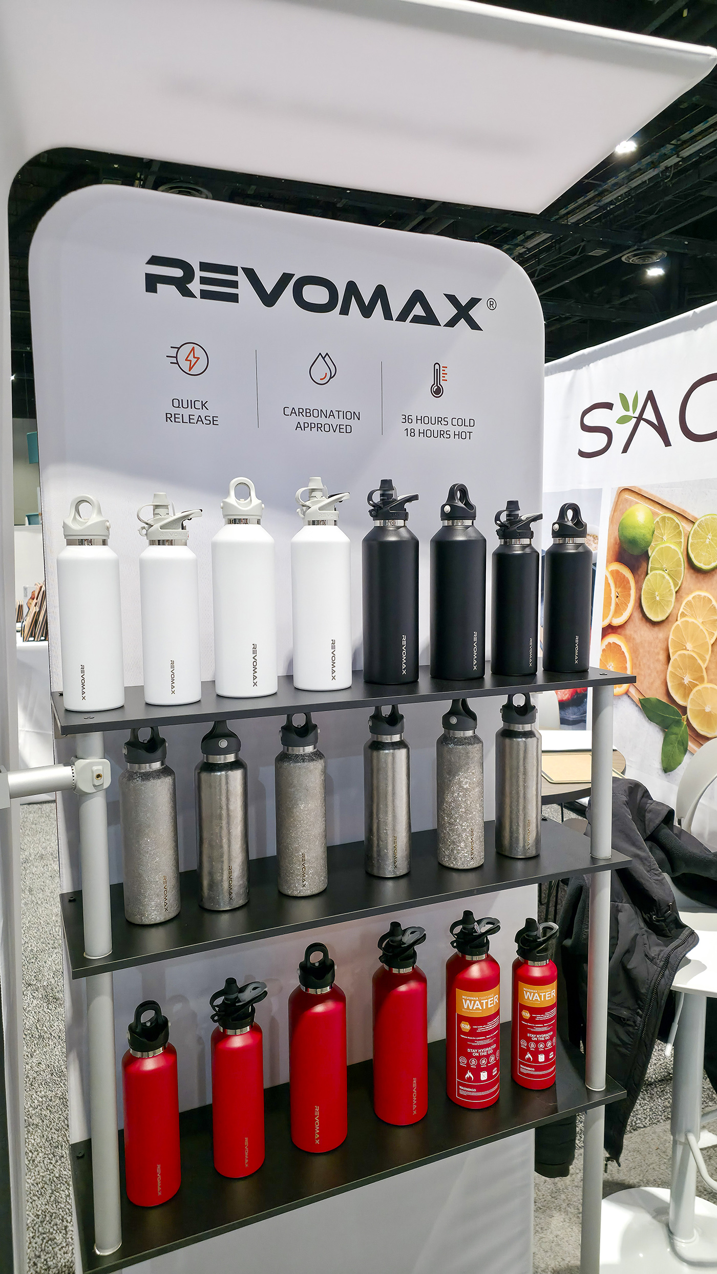 Inovativní termosky RevoMax udrží nápoje horké po dobu až 18 hodin a studené dokonce 36 hodin. To ale není jejich jediná přednost – disponují unikátním patentovaným uzávěrem, díky kterému do nich lze nalít i sycené nápoje bez rizika úniku tekutiny. Pro otevření stiskne uživatel pomocí palce, ukazováku a prostředníčku trojici tlačítek. K uzavření stačí stisknout jen středové tlačítko. Na výběr jsou i modely lahví s pítkem.