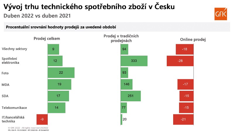 Pokud byste se teď probudili po třech letech z kryospánku a pohlédli na grafy GfK za duben a květen, nebudete nejspíš věřit vlastním očím. Čísla jsou samozřejmě naprosto v pořádku a nejde o žádnou chybu. Jsou však důsledkem situace v loňském roce, kdy byl do 10. května zavřený maloobchod a elektroniku a spotřebiče mohli lidé nakupovat pouze online. Celkem logicky tak vykázal trh za letošní duben celkový růst. Pohádková čísla u kamenných prodejen nemá smysl příliš rozebírat – letošní výsledky byly porovnávány s loňskými, kdy kamenné prodejny nefungovaly. Ergo růsty až ve stovkách procent.