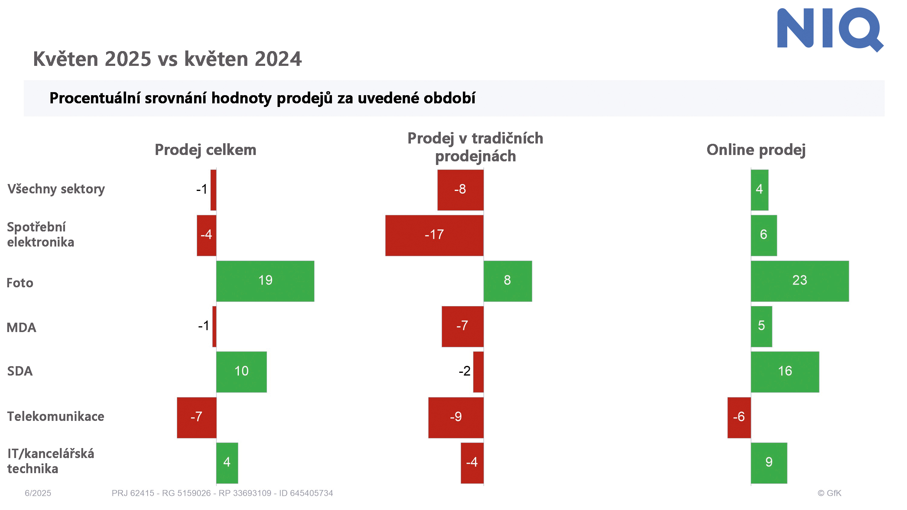 Přinášíme ve spolupráci se společností NIQ (GfK) výsledky trhu technického spotřebního zboží za duben a květen. Většina kategorií vykazuje spíše negativní trend, přičemž v květnu akceleroval meziroční propad hodnoty prodejů hlavně v kamenných prodejnách. Přestože se tématu fototechniky nevěnujeme, nelze její vysoký dvouciferný růst ani v jednom z měsíců přehlédnout. Důvodem je dle NIQ (GfK) dřívější nedostupnost některých modelů a jejich následné opětovné naskladnění, které způsobilo jednorázové vyšší prodeje.