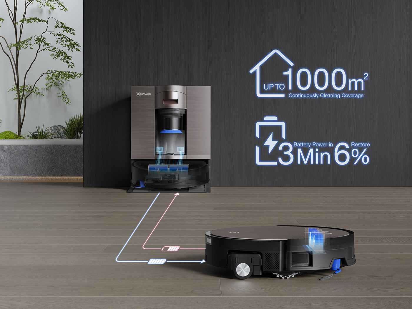 Vedle automatického vyprazdňování se stanice stará i o mytí mycího válečku horkou vodou s teplotou až 75 °C. Během tohoto procesu se vlákna důkladně očistí a připraví na další úklid. Inteligentní správa baterie s technologií PowerBoost a baterie 6 400 mAh zajišťují téměř nepřetržitý provoz robotu. Během mytí mopu si robot velmi rychle dobíjí baterii (6 % během 3 minut), což mu umožňuje pokračovat v úklidu velkých ploch bez zbytečných prodlev. V průběhu úklidu se totiž robot v závislosti na nastavení vrací pravidelně do základny, kde vždy doplní výrazně větší množství energie, než bylo dosud běžné.