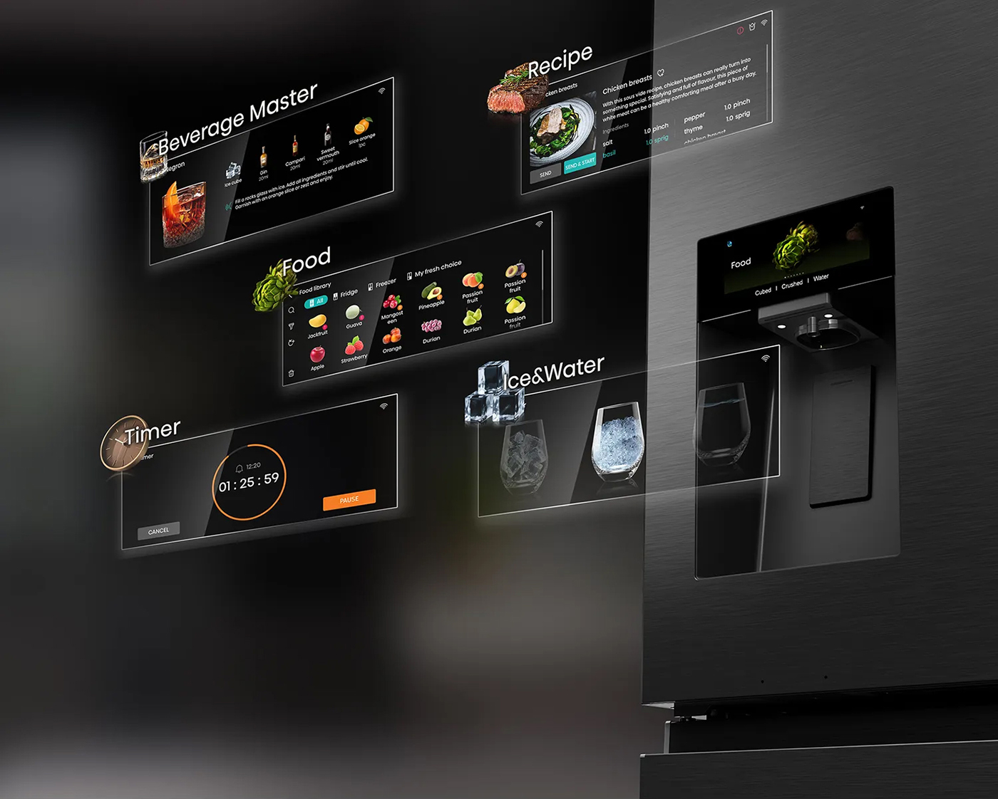 Řada PureView staví na myšlence chytrého domácího provozu a RQ600P7SKE to potvrzuje vestavěným Intelligent Hubem. Dotykový 6,86" displej přímo na dveřích mění chladničku v praktické centrum kuchyně. Jde o rozhraní, které pomáhá spravovat zásoby, sledovat jejich trvanlivost a včas upozornit na potraviny blížící se ke spotřebě. K tomu přidává inspiraci v podobě receptů a podporuje tvorbu vlastních nápojových kombinací. Intelligent Hub tak není jen designový doplněk, ale reálný pomocník, který usnadňuje plánování, vaření i každodenní rozhodování o tom, co je potřeba dokoupit.