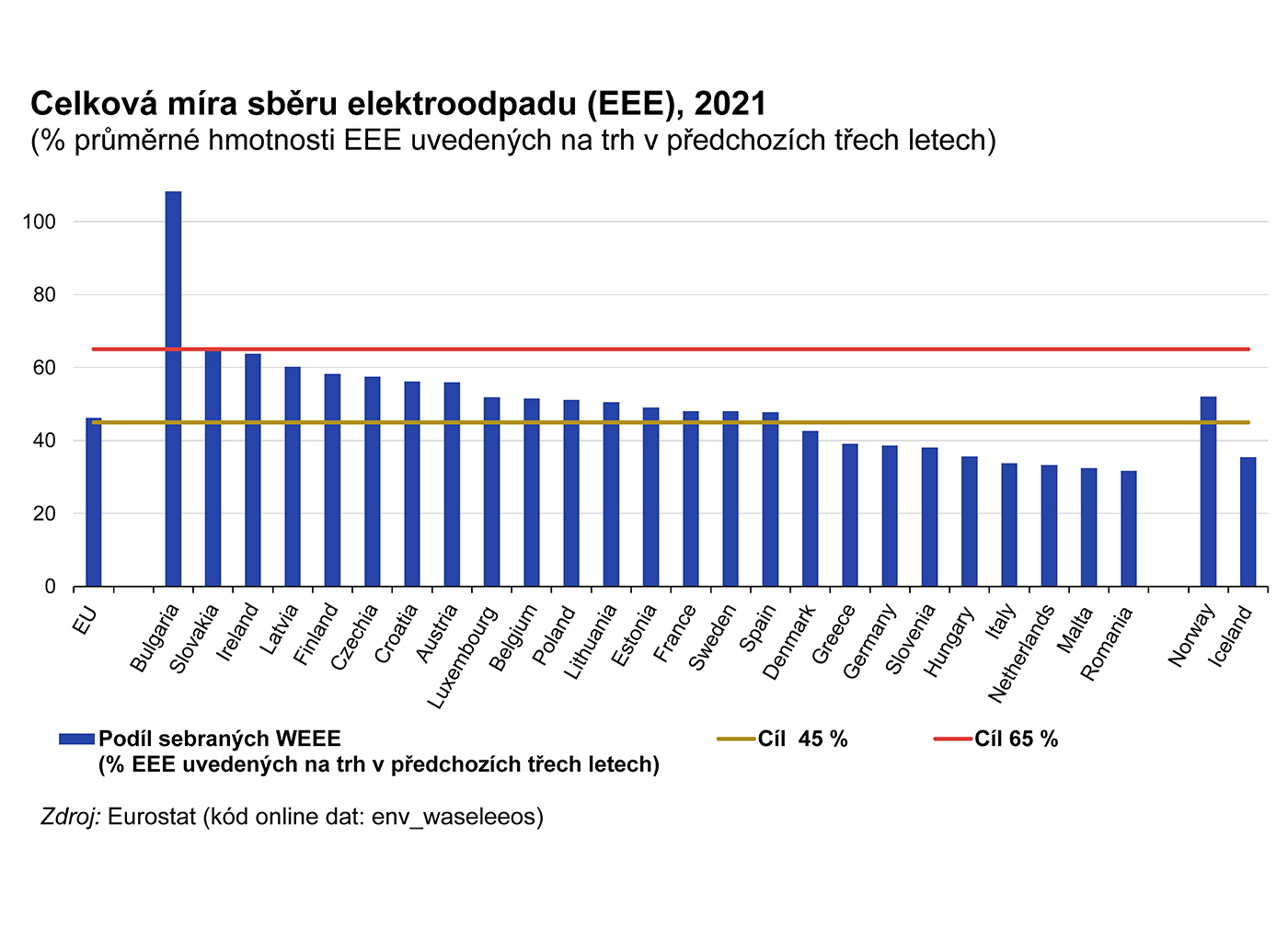 Směrnice o odpadních elektrických a elektronických zařízeních (WEEE) [směrnice 2012/19/EU ve znění směrnice (EU) 2024/884] vyžaduje oddělený sběr a správné nakládání s elektroodpady a stanoví cíle pro jejich sběr, využití a recyklaci. Minimální podíl sběru, kterého mají členské státy ročně dosáhnout, je 65 % průměrné hmotnosti elektrických a elektronických zařízení uvedených na trh v předchozích třech letech v dotčeném členském státě nebo alternativně 85 % OEEZ vzniklých na území tohoto členského státu. Většina členských států nedokázala odděleně shromáždit dostatečné množství OEEZ, a proto nesplnily cíl sběru. Komise doporučila členským státům, aby zvýšily své úsilí o provádění směrnice ke splnění svých povinností.