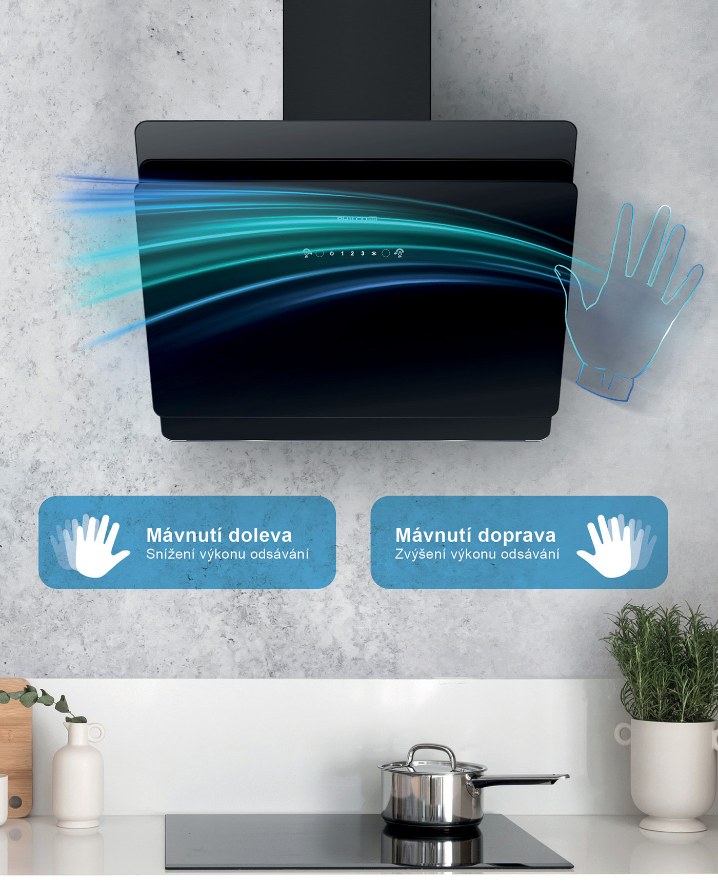 Při vaření, kdy máte plné ruce práce a často i ušpiněné od surovin, oceníte odsavač par, který díky inovativní funkci MoveControl spustíte jediným mávnutím ruky. Přesně to nabízí nový model Philco PEW 600 GCB.