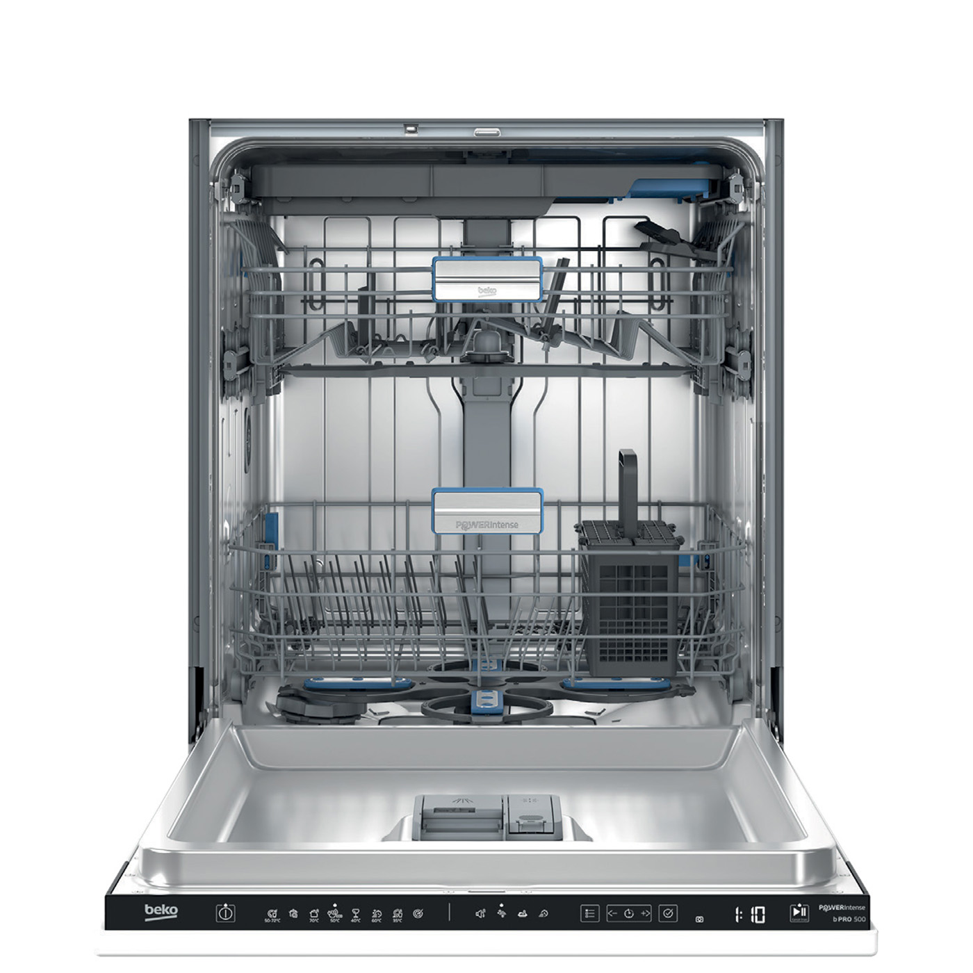 Modely nové řady myček Beko spojuje promyšlené řešení vnitřního prostoru s důrazem na snadné a efektivní vkládání nádobí. Třetí příborová přihrádka nabízí posuvné a výškově nastavitelné boční části, které umožňují vložení i šálků na espresso. Symboly na povrchu navádějí k ideálnímu rozmístění příborů, lžiček nebo dlouhých kuchyňských nástrojů pro optimální výsledek. Praktické jsou také vyjímatelné segmenty, které usnadňují manipulaci a čištění. Díky možnosti výškového nastavení středního koše je možné ve spodní části pohodlně mýt talíře o průměru až 30 cm, zatímco střední koš pojme sklenice na víno vysoké až 24 cm. Gumové držáky zajišťují bezpečné uchycení křehkého skla a nastavitelné trny umožňují flexibilní uspořádání podle aktuální náplně.