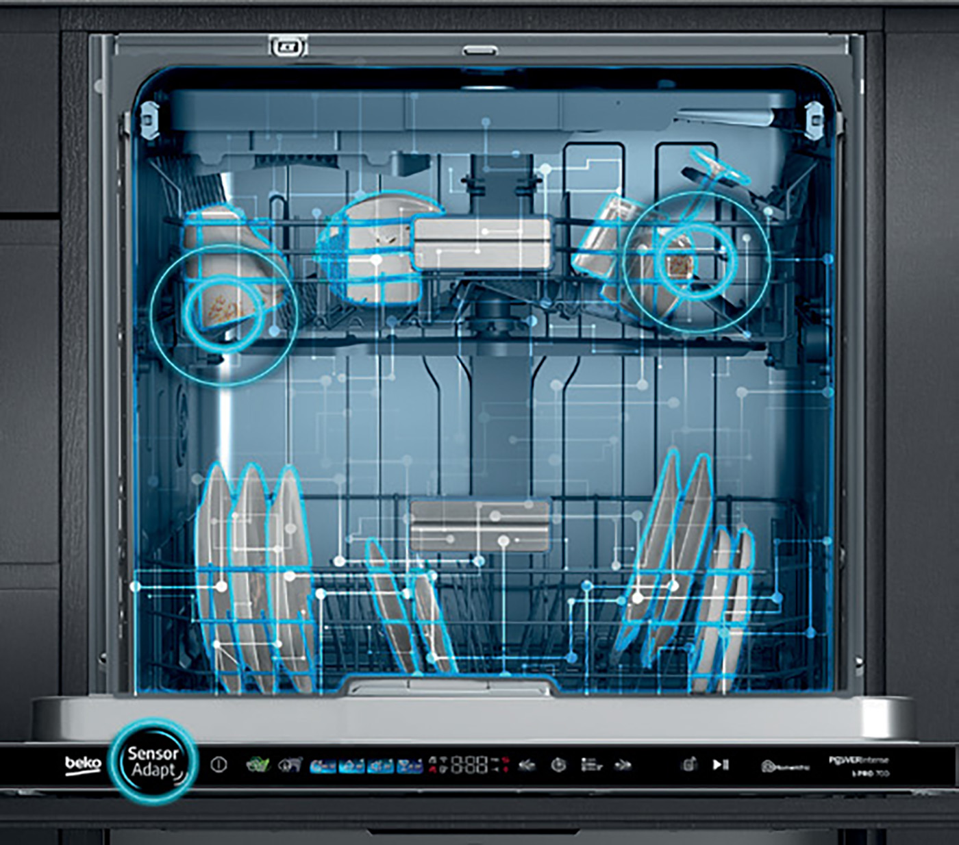 Technologie, která prostřednictvím senzorů detekuje množství a míru znečištění nádobí. Následně automaticky přizpůsobí délku cyklu, teplotu, množství vody a energii – vše pro dosažení optimálních výsledků při minimální spotřebě. Výsledkem je úspora až 50% vody, energie a času.