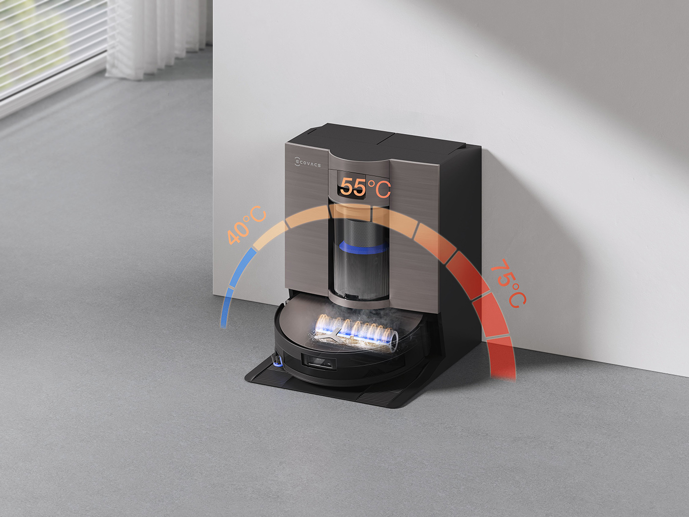 Vedle automatického vyprazdňování se stanice stará i o mytí mycího válečku horkou vodou s teplotou až 75 °C. Během tohoto procesu se vlákna důkladně očistí a připraví na další úklid. Inteligentní správa baterie s technologií PowerBoost a baterie 6 400 mAh zajišťují téměř nepřetržitý provoz robotu. Během mytí mopu si robot velmi rychle dobíjí baterii (6 % během 3 minut), což mu umožňuje pokračovat v úklidu velkých ploch bez zbytečných prodlev. V průběhu úklidu se totiž robot v závislosti na nastavení vrací pravidelně do základny, kde vždy doplní výrazně větší množství energie, než bylo dosud běžné.