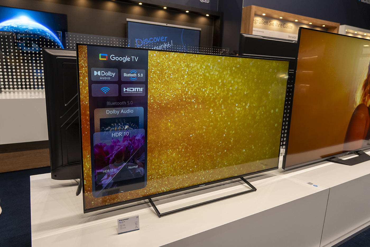 Hlavním lákadlem expozice byl bezpochyby nový vlajkový model – 100" Mini LED televizor. Tento obr ukazuje, že Blaupunkt míří do prémiového segmentu. S výbavou čítající 1 600 zón lokálního stmívání je zajištěna vysoká úroveň černé a vysoký kontrast, což je klíčovou výhodou technologie Mini LED. Nechybí podpora formátu Dolby Vision. V oblasti zvuku samozřejmě Dolby Atmos, což však ještě nic neznamená, protože se tímto zvukovým standardem dnes ohání kdekdo. Co považujeme za zásadní, že má televizor integrovaný subwoofer, takže i bez soundbaru nebo reproduktorů pro domácí kino nechybí zvuku hloubka.