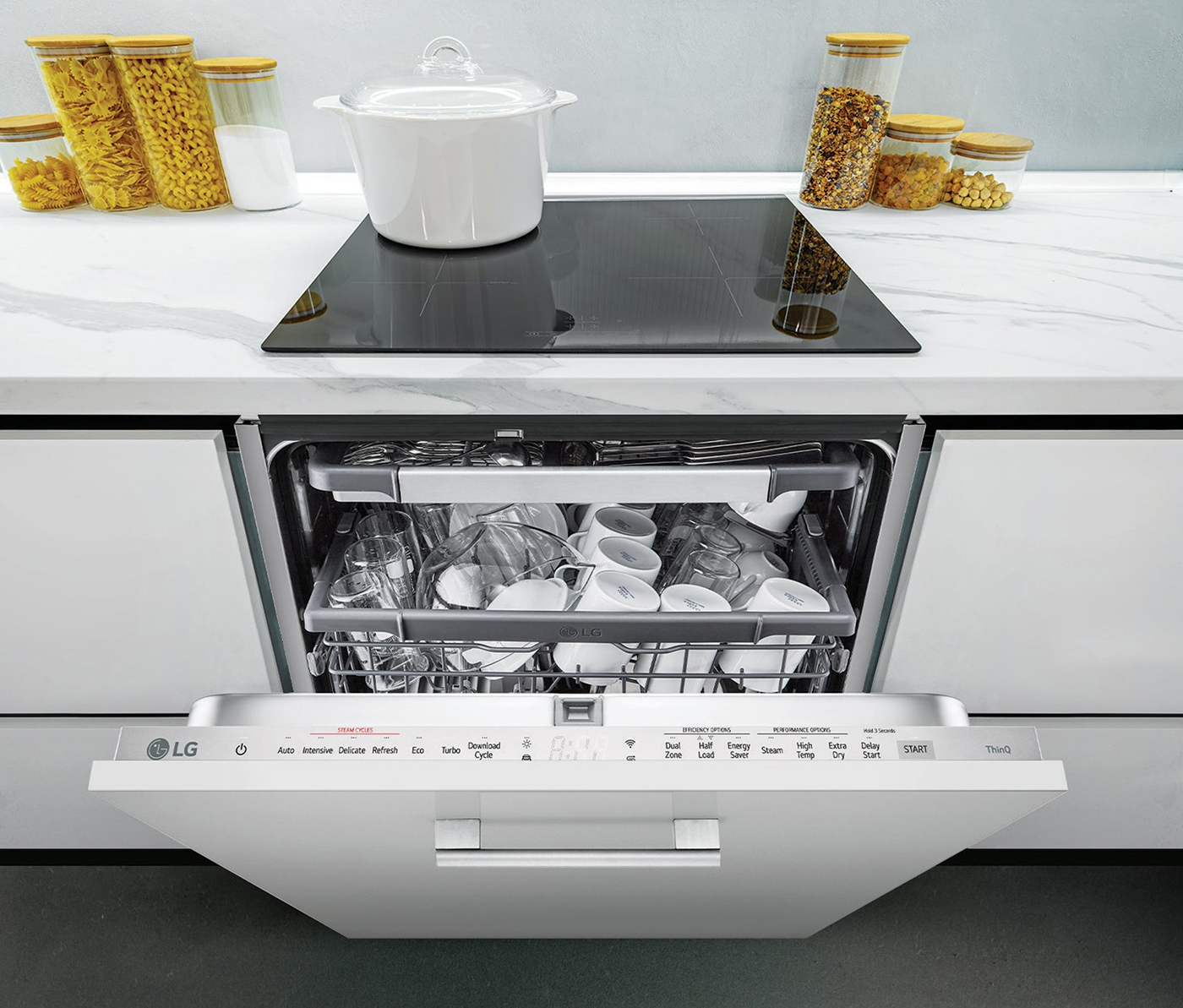 Základem myček LG je nekompromisní čistota a vysoká účinnost. O dokonalé umytí nádobí z každého úhlu se stará technologie QuadWash™. Na rozdíl od tradičních systémů se dvěma rameny využívá hned čtyři vícesměrná ostřikovací ramena, která se otáčejí a rotují, aby trysky s vysokým tlakem vody zasáhly každý kout myčky. Pro ještě vyšší hygienu a lesk bez zaschlých kapek je připravena technologie TrueSteam™. Vysokoteplotní pára efektivně odstraňuje zaschlé nečistoty a současně likviduje až 99,99 % bakterií. Srdcem myček je úsporný a tichý motor Inverter DirectDrive™, který umožňuje dosažení nejvyšší energetické účinnosti.