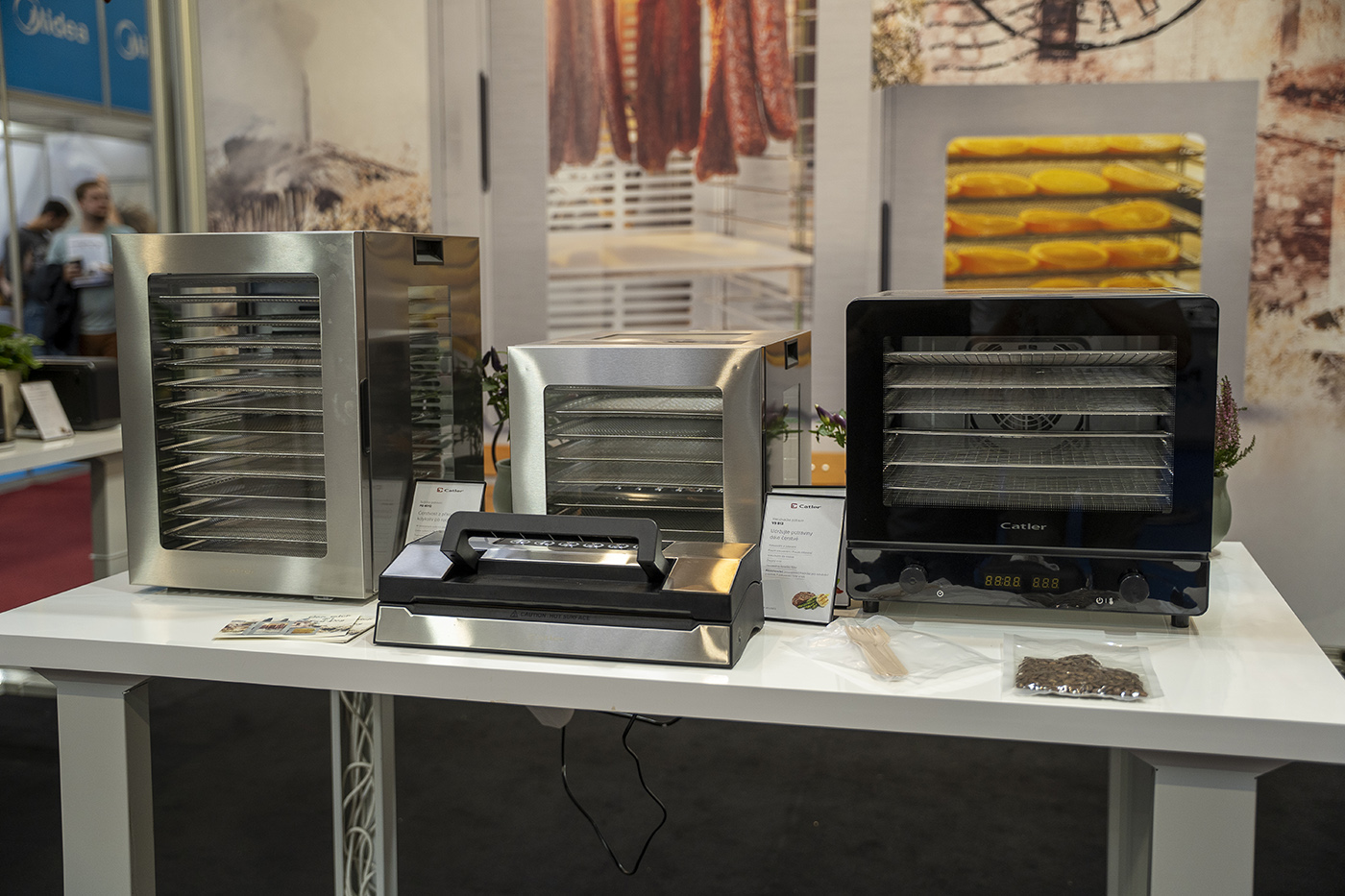 U značky Catler jsme si všimli novinek zejména v sekci sušiček potravin – model nalevo (FD 4012) a uprostřed (FD 4011) nabízejí plata o velikosti 28 × 28 cm a teplotní rozsah 35–75 °C. Větší varianta má 14 pater, menší 8.